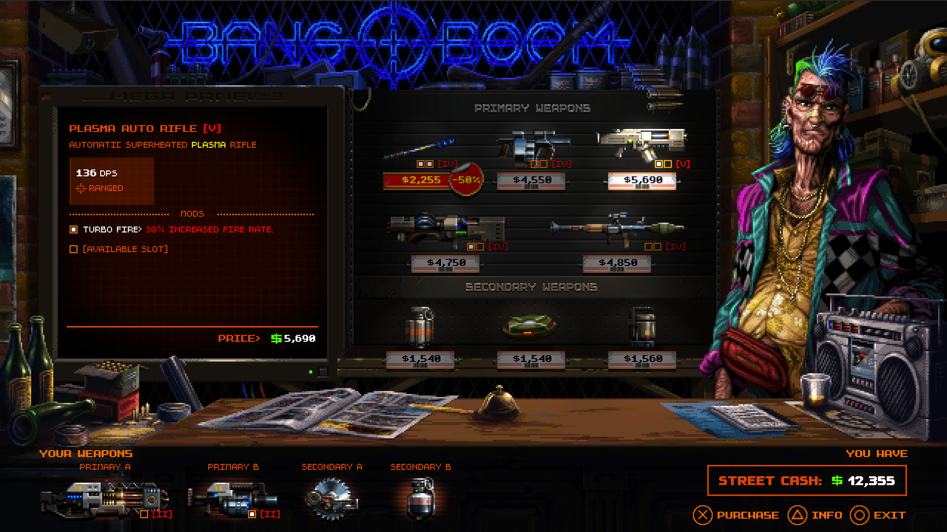 Fast, violent run-and-gun action ripped straight from VHS-era blockbusters. Tight controls meet brutal firefights in a roguelite loop designed for pure adrenaline. Collect bounties and survive as long as you can. When you finally go down, Tony drags you back to his operating table and rebuilds you stronger.